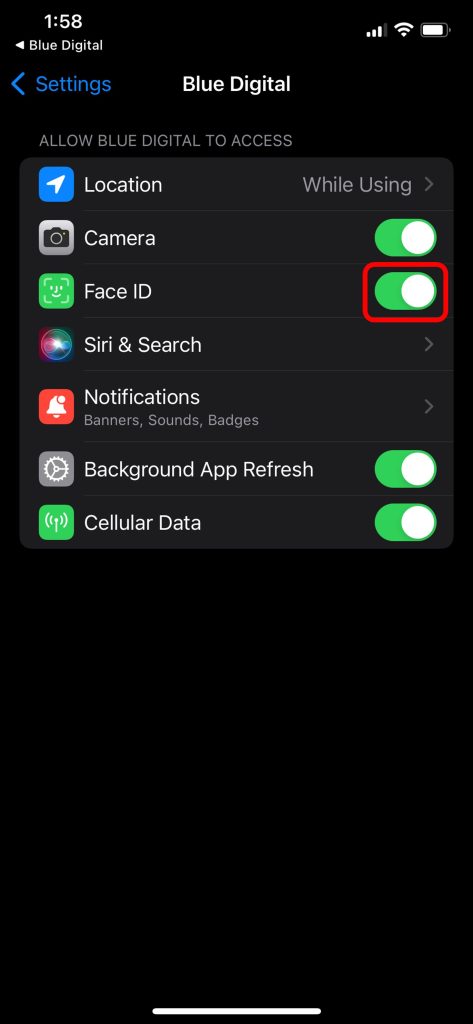 4. Press the toggle next to Face ID to enable or disable Face ID in Blue Digital. If it is green, it is enabled. If it is grey, it is disabled.