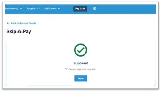 After you have selected your loan, a new page with only your loan details will load. Select “Skip-a-Pay.”